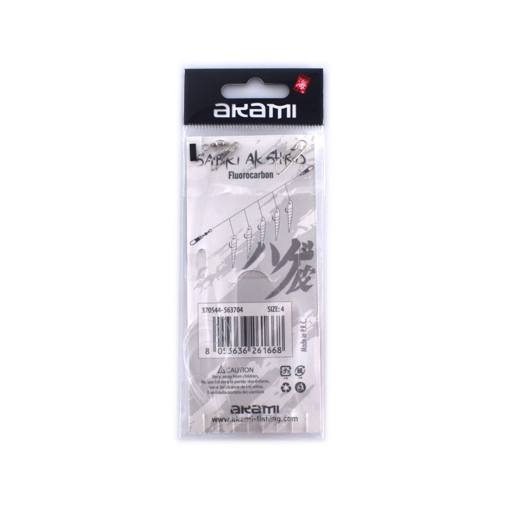 Sabiki Shrimp Akami Series AKSHWH je sistem s 5 zlatnih udica, gumenim škampima i svjetlećim nitima, sastavljen od 100% fluorougljika visoke čvrstoće. Nevidljiv u vodi i otporan na abraziju, kidanje i UV zrake, savršen je za skušu, šnjura, španjolsku skušu i druge pelagične ribe, kako u obalnim vodama tako i na otvorenom moru.