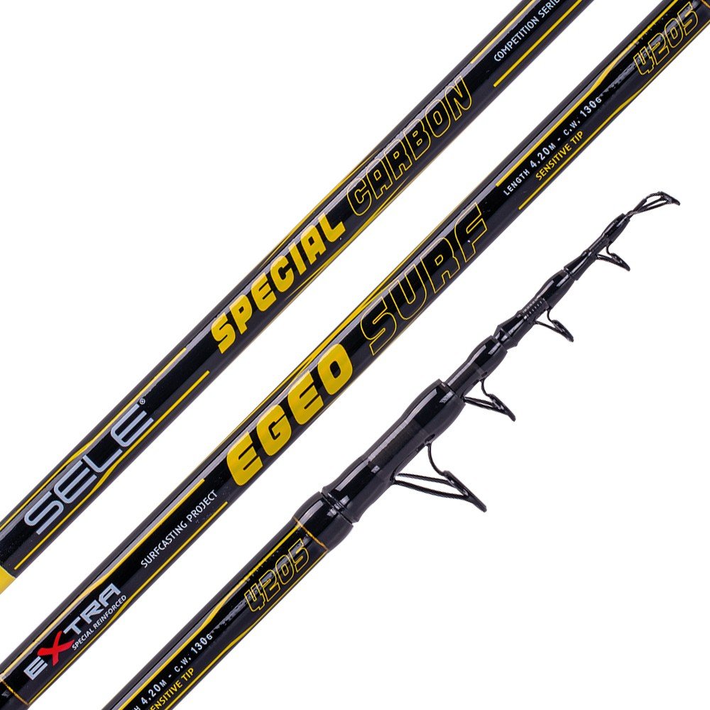 Sele Egeo Surf, štap za surfcasting izrađen od blanka od visokomodulnog karbona, ima dvostruko omotane vodilice, vijčani držač role i žuti vrh za bolju vidljivost tijekom noćnog ribolova. Dostupan je u četiri različite težine bacanja, od 130 grama do 200 grama.